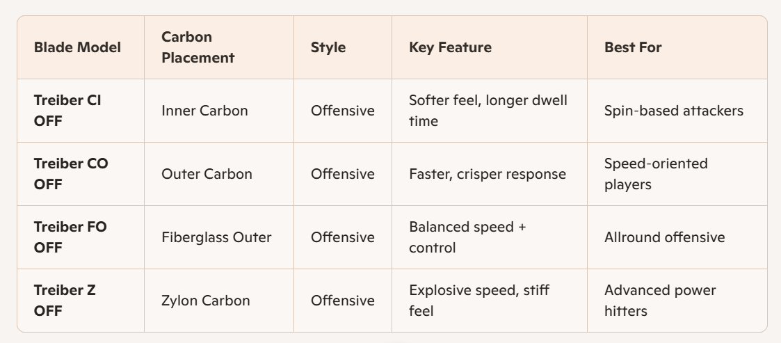 The Treiber FO Offensive S is a synthetic fiber-reinforced blade and a must-have. The immediate passing of the impulse to the hitting hand, the direct transfer of the impact energy to the ball, as well as the wide and open tempo scale make this blade construction indispensable in modern times.