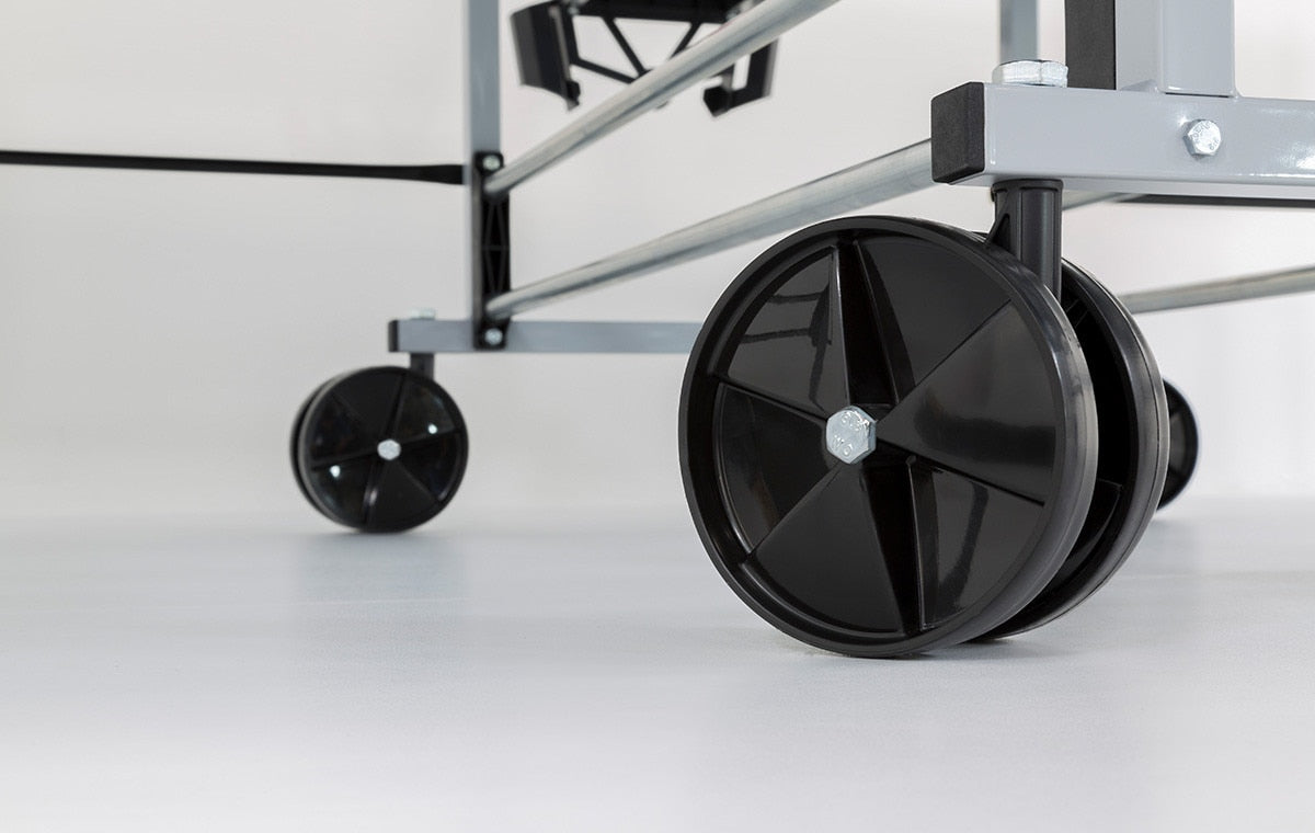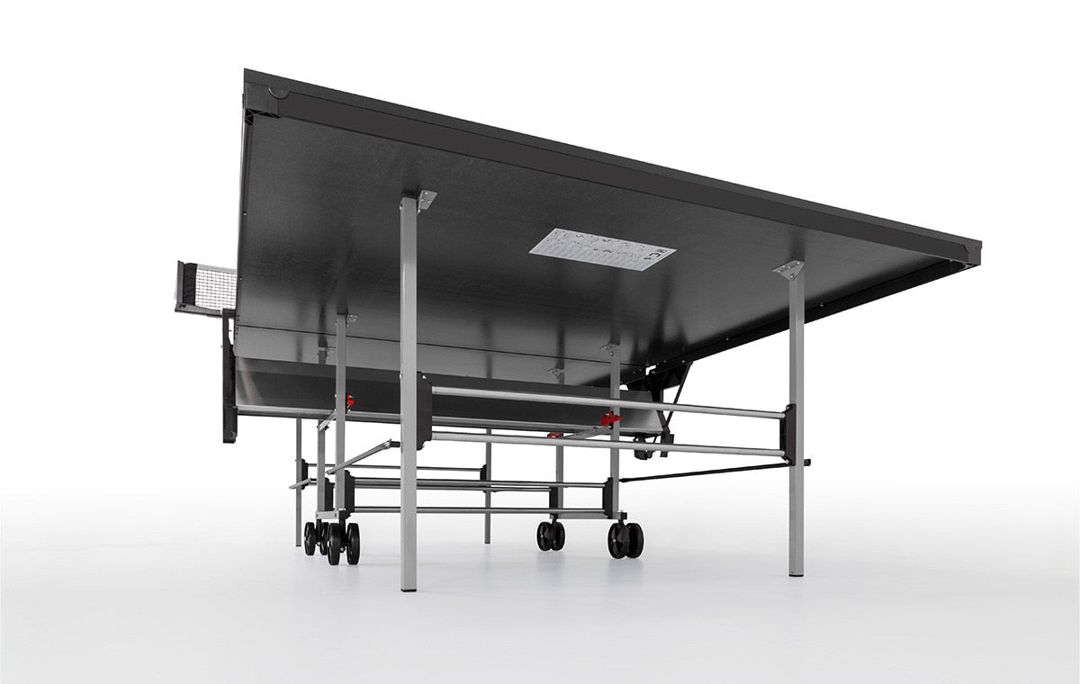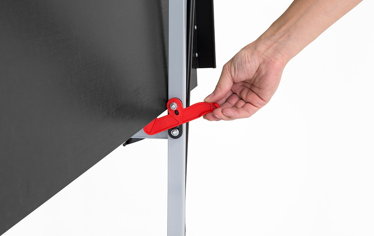 The legs are indented from the ends and sides of the table for unhindered footwork. Two safety levers on each table side provide an effective child safety feature. Designed so players can fold-up one side of the table into playback or both sides into storage position without removing the net.