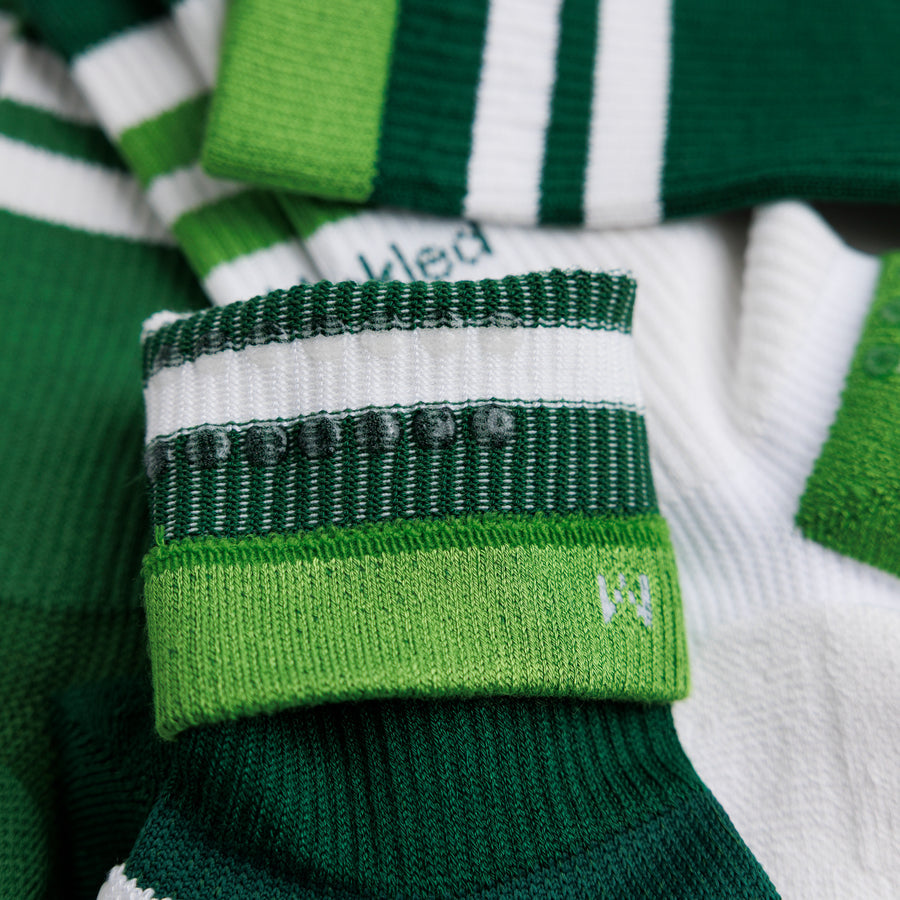 - 3 pairs of crew socks in two-tone green and white featuring a standout white base pair stitched with ‘get pickled' on the front